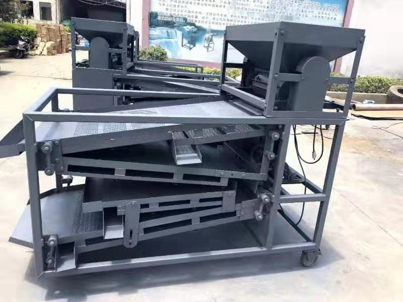 原枝花椒投進料斗后--------粉碎裝置將原枝花椒進行粉碎,將枝葉殼籽分別剝離下來--------通過下料器一起落到篩面上進行分離篩分---------一層將篩出來的是大枝干、梅花椒、石子,復試篩網篩出來的是花椒枝--------二層篩出來的是花椒籽,椒籽出來的地方有風機,將里面輕的雜質篩選出來-------三層是為篩分椒枝設計,整層篩出來都是花椒枝------底層篩出來的是花椒殼,復試篩網是塵土雜質等。